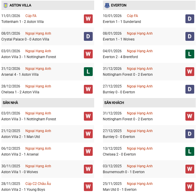 - Aston Villa thắng 7, hòa 2, thua 1 trong 10 trận gặp Everton gần đây.