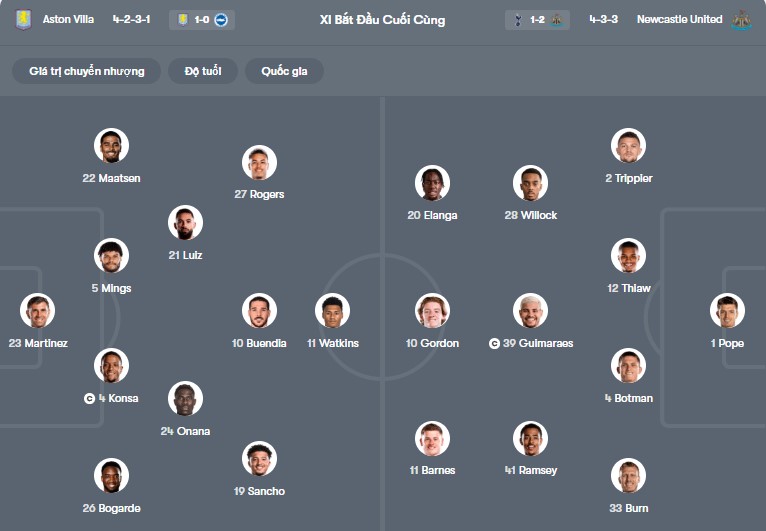 Đội hình dự kiến Aston Villa vs Newcastle: