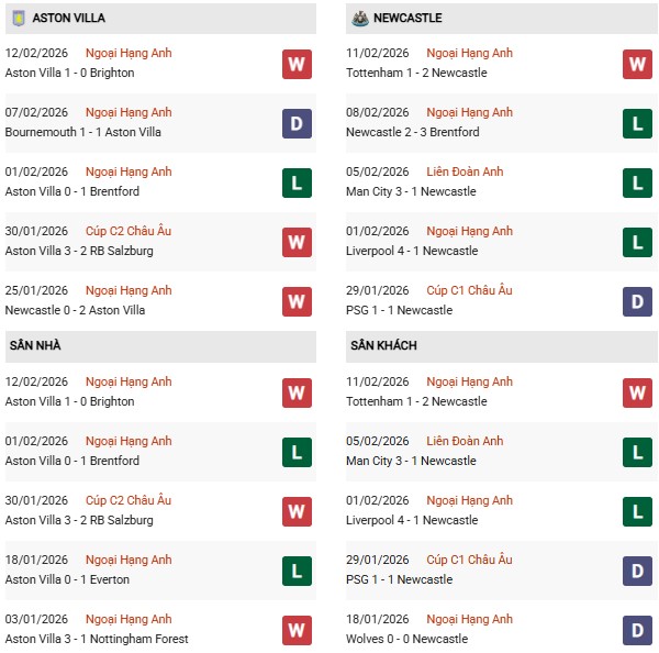 Thành tích đối đầu Aston Villa vs Newcastle:
