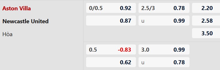 Thông tin tỷ lệ bóng đá Aston Villa vs Newcastle: