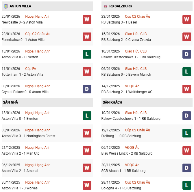 Thống kê phong độ Aston Villa vs RB Salzburg: