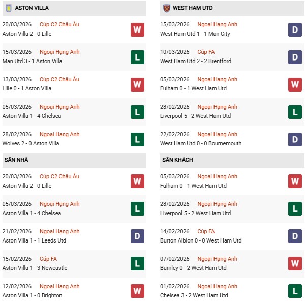 - Trên sân nhà, Aston Villa thắng 3, thua 4 trước West Ham.