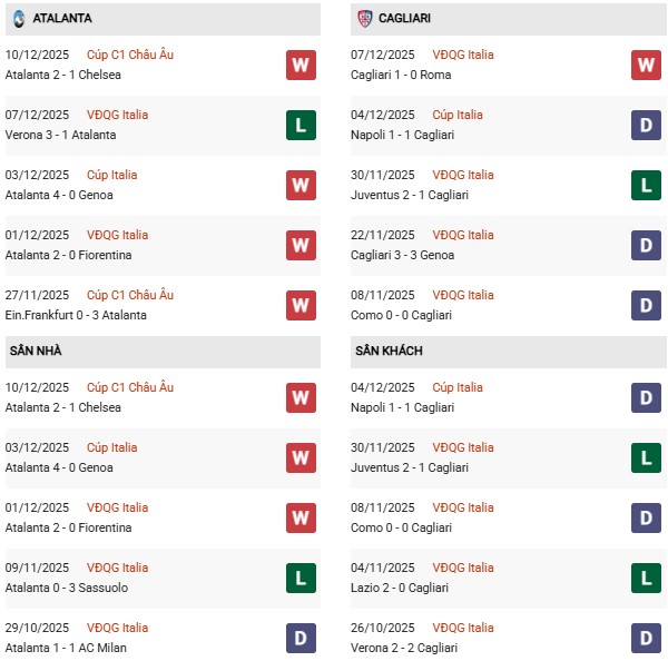 - Trên sân nhà, Atalanta thắng 5, thua 4 trước Cagliari.