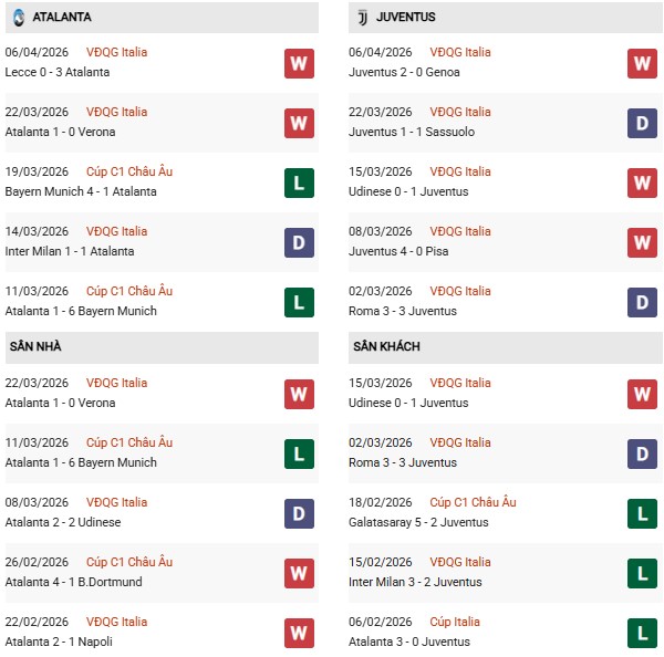 Thống kê phong độ Atalanta vs Juventus: