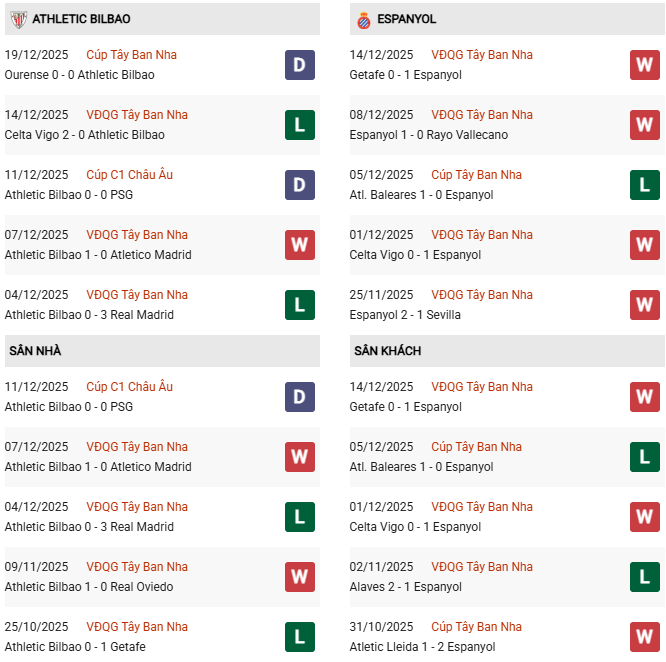 - Trên sân nhà, Athletic Bilbao thắng 6, thua 2 trước Espanyol.