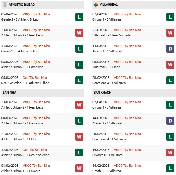 Thống kê phong độ Athletic Bilbao vs Villarreal: