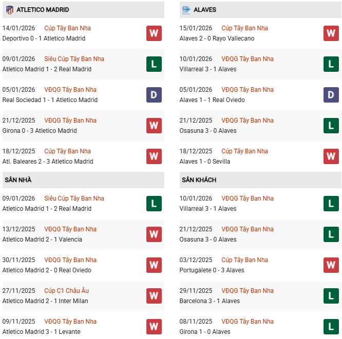 Ở vòng này, họ chỉ phải gặp Alaves. So với Atletico, Alaves đang xếp thứ 16 khi có 19 điểm. Họ đang chỉ hơn nhóm "cầm đèn đỏ" có 2 điểm, cụ thể là nhỉnh hơn CLB xếp thứ 18 là Valencia (17 điểm). Phong độ của Atletico vs Alaves có sự chênh lệch lớn vào lúc này. Cụ thể, trong khi Atletico thắng 5/7 trận gần nhất thì Alaves chỉ thắng 2/6 trận vừa xong.