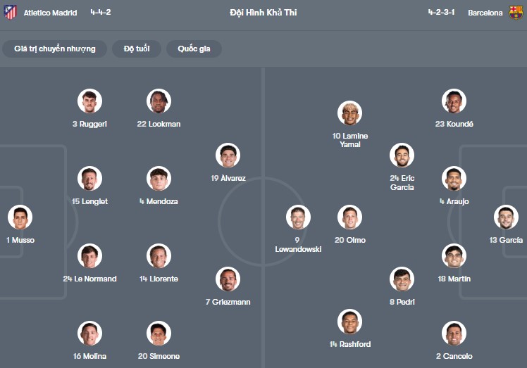 Đội hình dự kiến Atletico Madrid vs Barcelona: