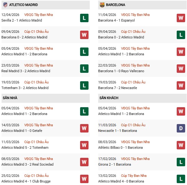 Thống kê phong độ Atletico Madrid vs Barcelona: