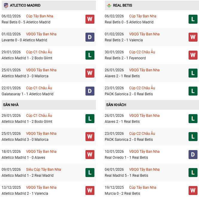 Thống kê phong độ Atletico Madrid vs Betis: