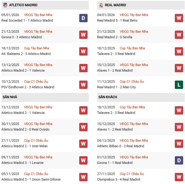Thống kê phong độ Atletico Madrid vs Real Madrid: