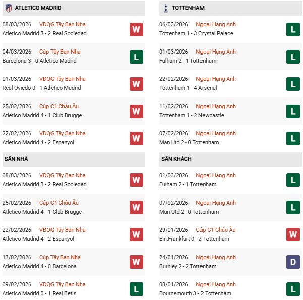 Phong độ của Atletico vs Tottenham đang rất chênh lệch. Nếu như chúng ta vừa đề cập việc Tottenham toàn thua ở 5 trận gần nhất thì Atletico thắng 4/5 trận vừa qua. Trên sân nhà, Atletico đang có mạch 4 trận thắng liên tiếp. Rộng hơn, Atletico thắng 7/10 trận ở sân nhà gần đây. Về phía đội khách Tottenham, họ thắng 2/10 trận vừa qua
