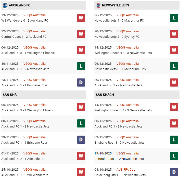 Thống kê phong độ Auckland FC vs Newcastle Jets: