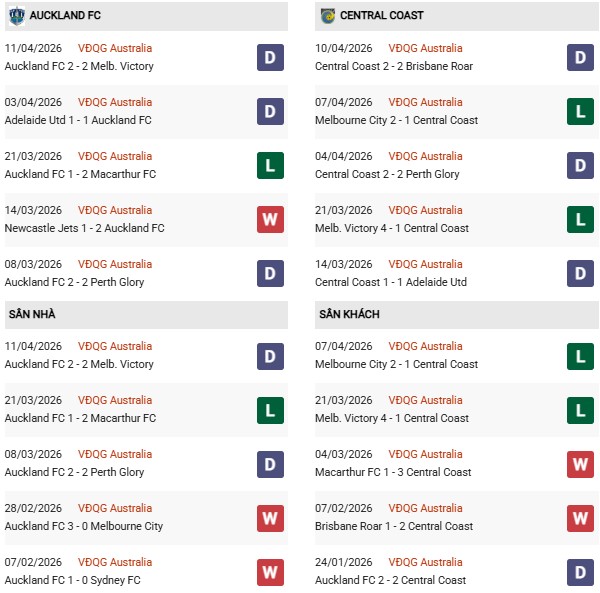 - Auckland thắng 2, hòa 2 trong 4 trận gặp Central Coast gần đây.