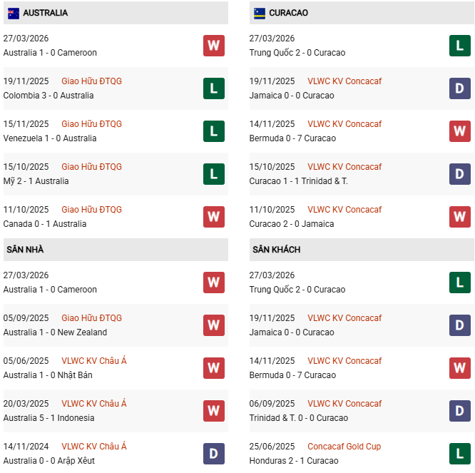 Thống kê phong độ Australia vs Curacao: