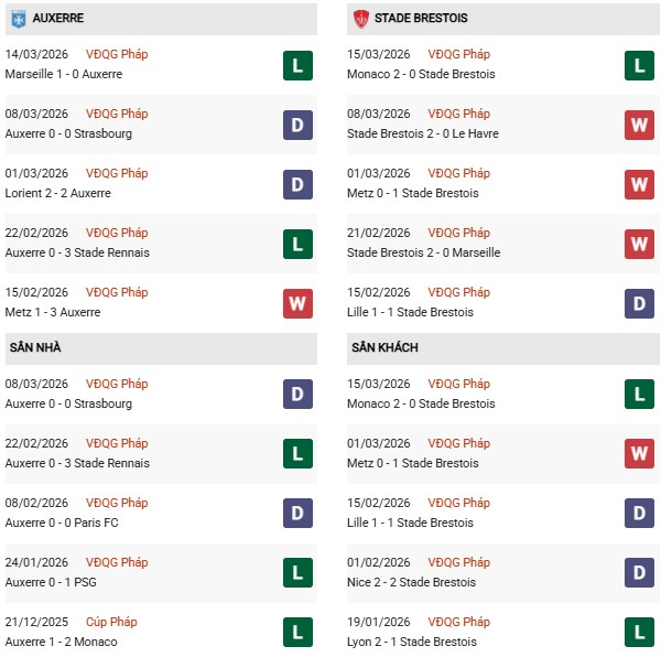 - Auxerre thắng 2, hòa 3, thua 5 trong 10 trận gặp Brest gần đây.