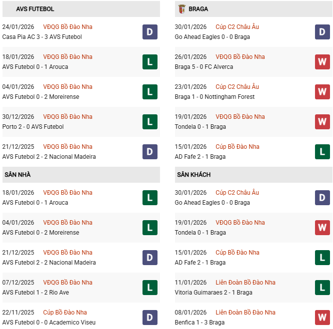 - AVS hòa 1, thua 2 trong 3 trận đối đầu Braga gần đây.