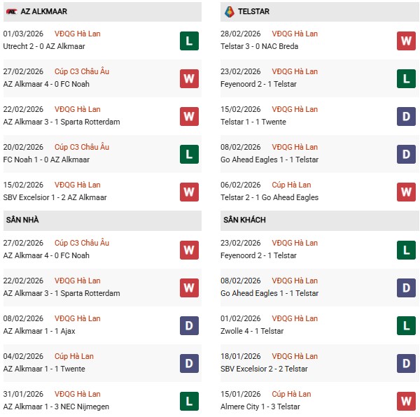 Tuy nhiên, phong độ tổng thể của Telstar chưa thực sự thuyết phục khi 10 trận gần nhất họ thắng 3, hòa 3 và thua 4. Trên sân khách, thành tích 4 thắng, 4 hòa, 2 thua cho thấy sự lì lợm nhất định. Dẫu vậy, việc phải làm khách trước một AZ giàu kinh nghiệm ở sân chơi cúp là thử thách vượt tầm đối với Telstar.