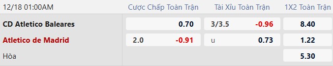 Thông tin kèo bóng đá Baleares vs Atletico Madrid: