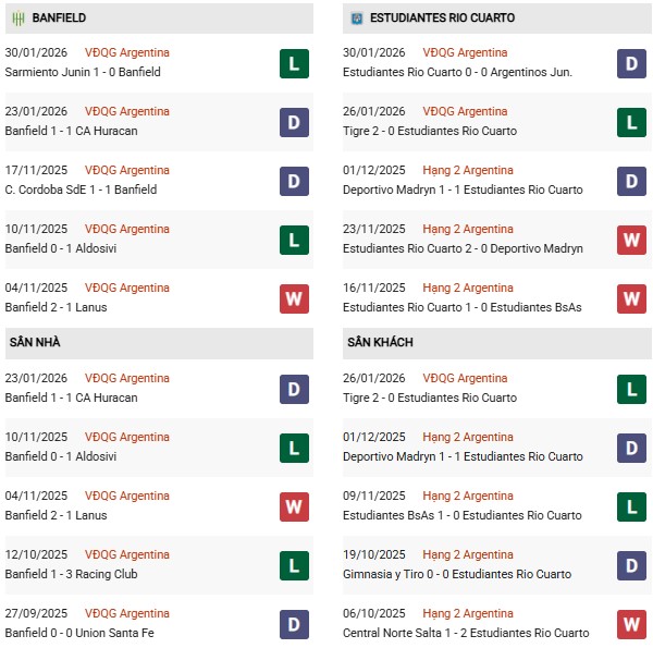 Dù vậy, nếu nhìn vào phong độ dài hạn, Estudiantes Rio Cuarto lại không quá tệ khi thắng 5, hòa 3 và chỉ thua 2 trong 10 trận gần nhất trên mọi đấu trường. Thành tích sân khách của họ ở giai đoạn này cũng ở mức chấp nhận được với 3 chiến thắng, 3 trận hòa và 4 thất bại trong 10 chuyến hành quân gần đây. Tuy nhiên, khi phải làm khách trên sân của Banfield, Estudiantes Rio Cuarto nhiều khả năng vẫn sẽ ưu tiên lối chơi phòng ngự chắc chắn.