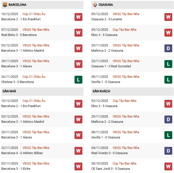 - Trên sân nhà, Barcelona thắng 9, thua 1 trước Osasuna.
