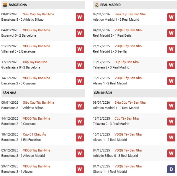 Cách đây một năm, Barca cũng từng đánh bại Real Madrid với tỷ số 5-2 để lên ngôi, và nhà vô địch La Liga sẽ bước vào trận đấu này với chuỗi 9 trận thắng liên tiếp trên mọi đấu trường. Đội bóng của Flick thực tế chưa thua trận nào ở giải quốc nội kể từ thất bại 2-1 trước chính Real Madrid tại La Liga hồi cuối tháng 10/2025 và hai gã khổng lồ của bóng đá Tây Ban Nha đang chuẩn bị đối đầu lần thứ 263 trong lịch sử.