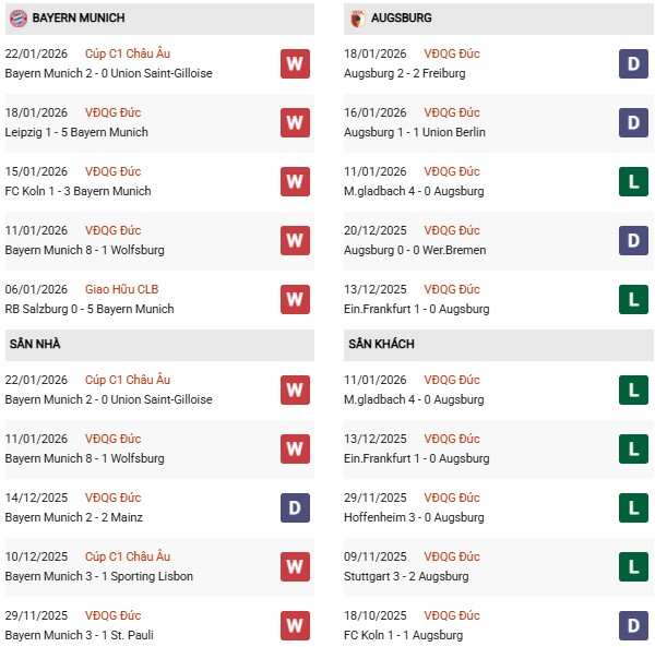 Thống kê phong độ Bayern Munich vs Augsburg: