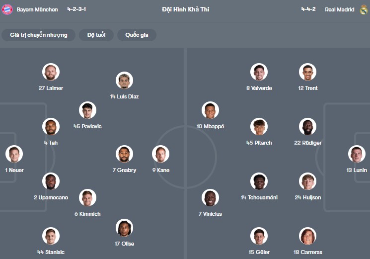 Đội hình dự kiến Bayern Munich vs Real Madrid: