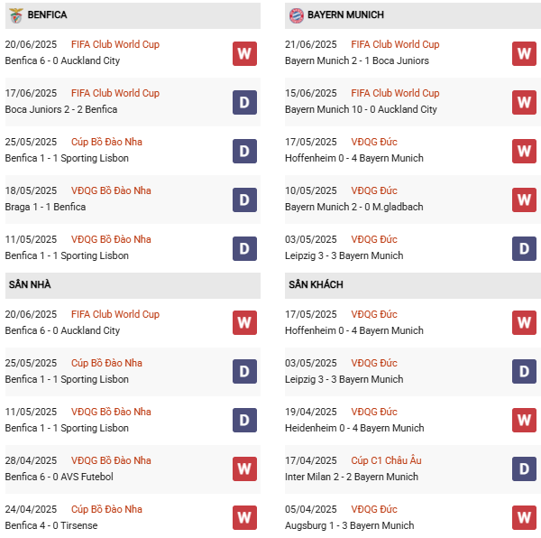 Thành tích đối đầu Benfica vs Bayern Munich: