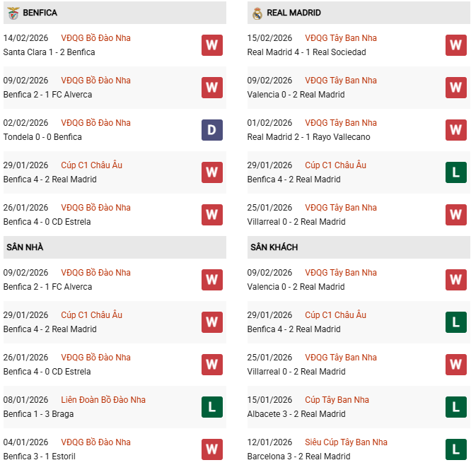 Nên biết rằng, trong quá khứ, Real Madrid luôn bị lép vế khi đối đầu với Benfica. Cụ thể, trong 3 cuộc đụng độ, đội bóng Hoàng gia Tây Ban Nha không biết mùi chiến thắng, khi hòa 1 và thua 2 trận, bao gồm thảm bại 2-4 ở vòng phân hạng Champions League 2025/26.