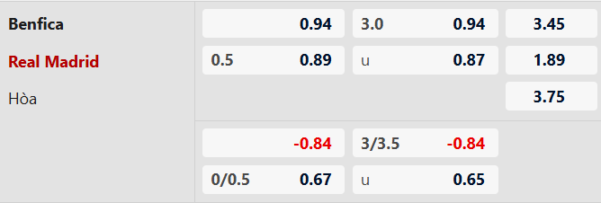 Thông tin tỷ lệ bóng đá Benfica vs Real Madrid:
