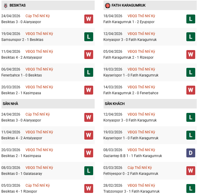 - Besiktas thắng 6, hòa 3, thua 1 trong 10 trận gặp Karagumruk gần đây.