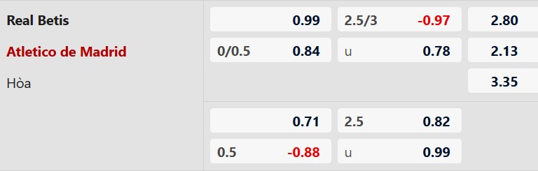 Thông tin tỷ lệ kèo bóng đá Betis vs Atletico Madrid:
