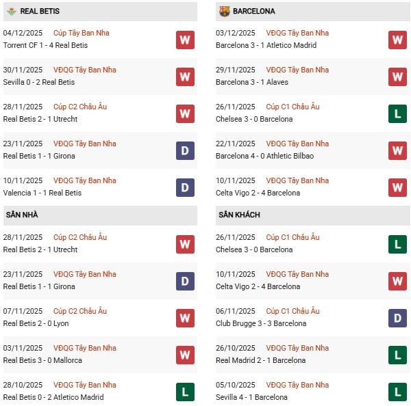 - Betis thắng 1, hòa 3, thua 6 trong 10 trận gặp Barcelona gần đây.