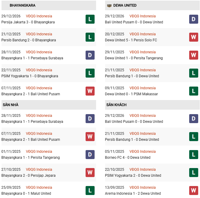 Thống kê phong độ Bhayangkara vs Dewa United: