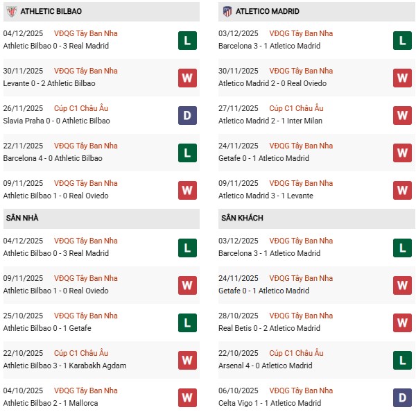 Thống kê phong độ Bilbao vs Atletico Madrid: