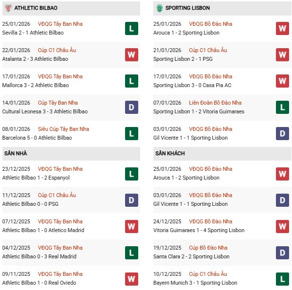 Thống kê phong độ Bilbao vs Sporting Lisbon: