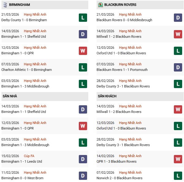 Thống kê phong độ Birmingham vs Blackburn: