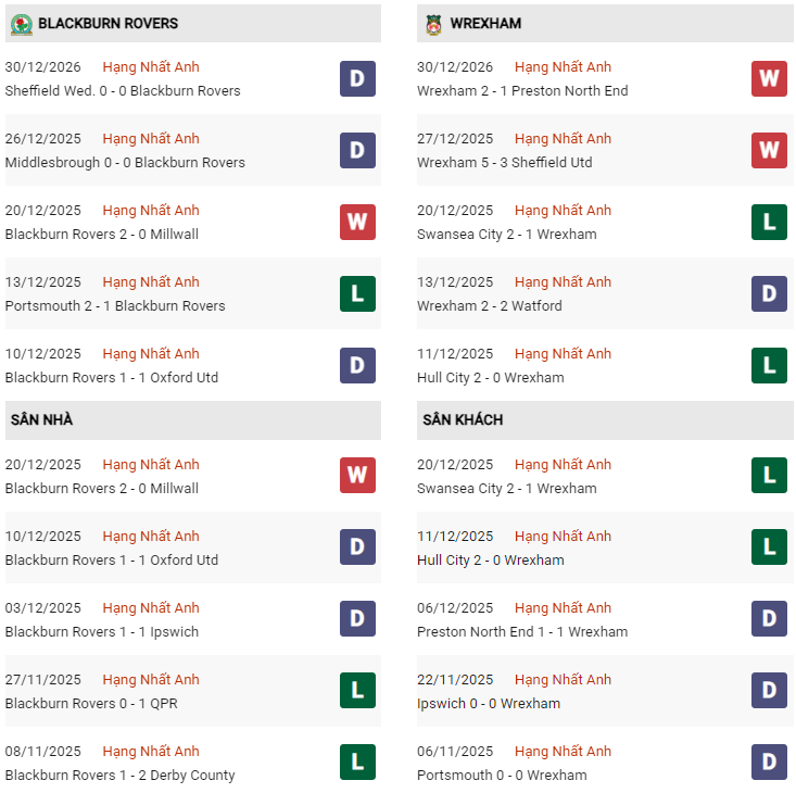 - 3 lần gần nhất gặp nhau, Blackburn thắng 1 và hòa 2 trước Wrexham