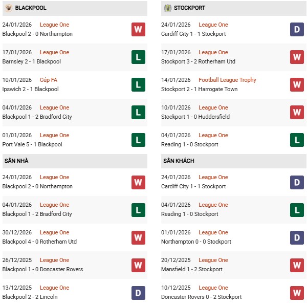 Phong độ 10 trận gần nhất của họ khá tích cực với 5 chiến thắng, 3 trận hòa và 2 thất bại. Trên sân khách, Stockport cũng không quá lép vế khi thắng 4, hòa 3 và thua 3 trong 10 chuyến hành quân gần đây, đủ để họ tự tin hướng đến một kết quả có lợi trước Blackpool.