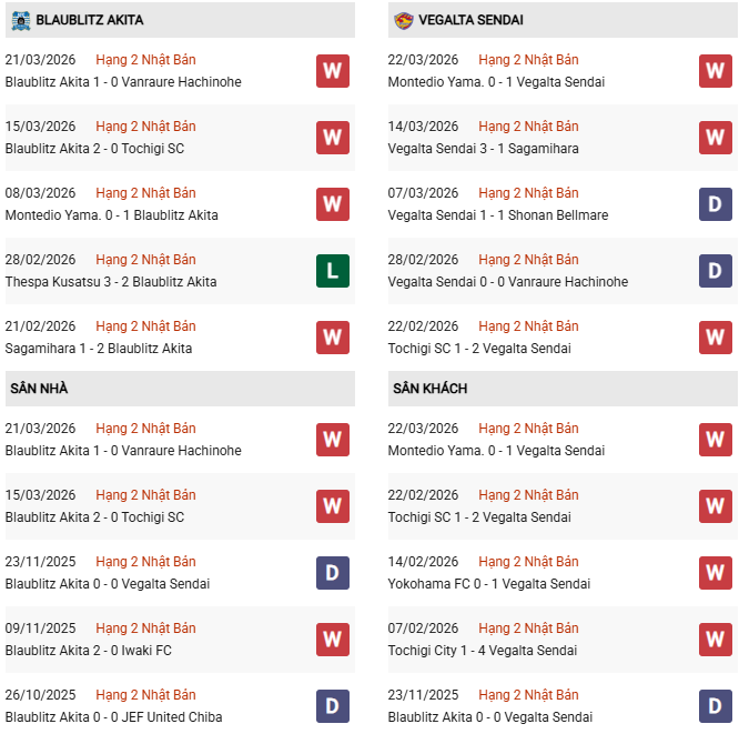 Phong độ của Blaublitz vs Vegalta Sendai ở giai đoạn này đều rất ổn. Trong khi Blaublitz thắng 7/10 trận gần nhất thì Vegalta Sendai cũng sở hữu thành tích tương tự, tính trong 90 phút.