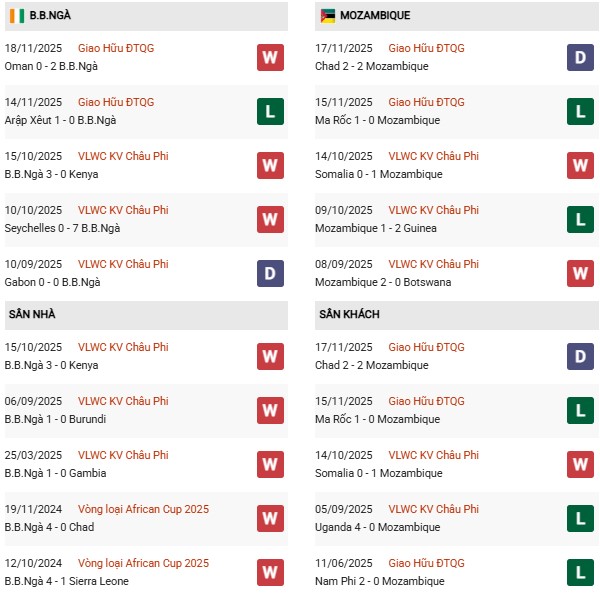 Thống kê phong độ Bờ Biển Ngà vs Mozambique: