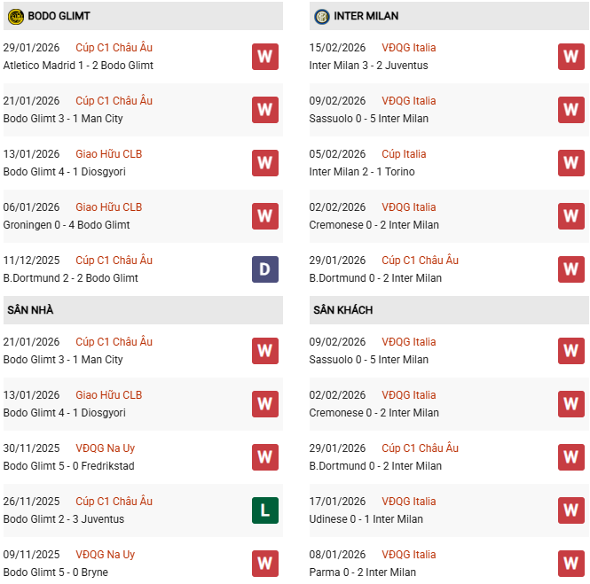 Thành tích đối đầu Bodo Glimt vs Inter Milan: