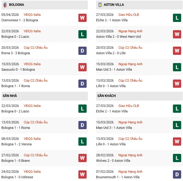 - Bologna toàn thua cả 2 trận đối đầu Aston Villa gần đây.