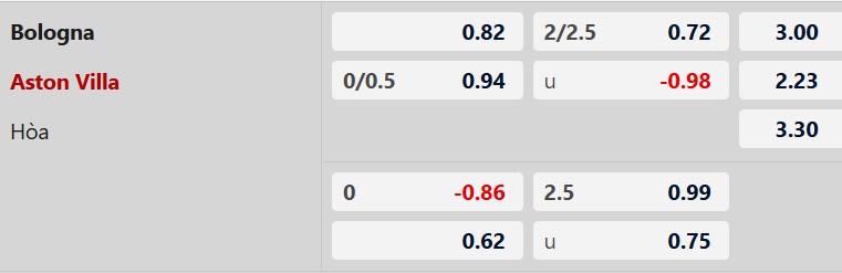 Thông tin tỷ lệ kèo bóng đá Bologna vs Aston Villa: