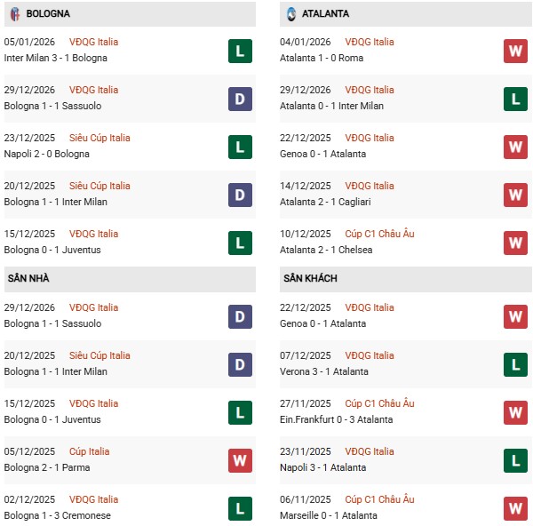 Thống kê phong độ Bologna vs Atalanta: