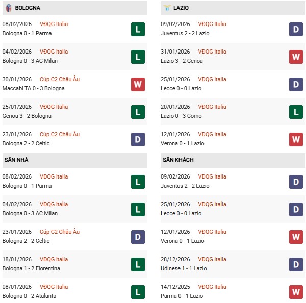 Thống kê phong độ Bologna vs Lazio: