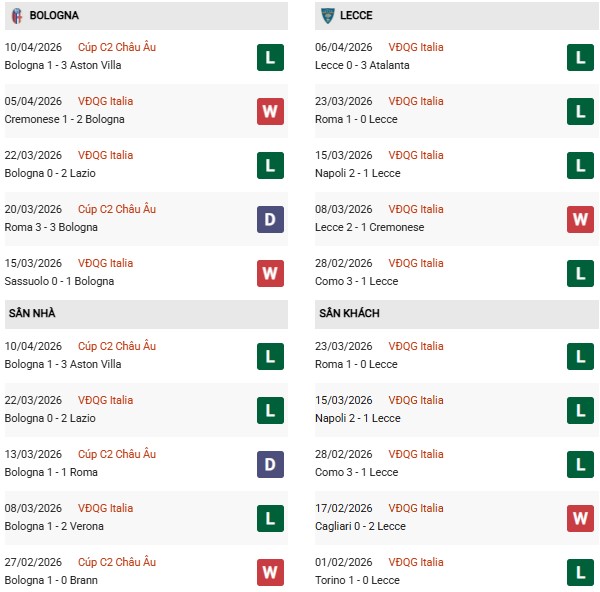 Chính thành tích này càng biến Bologna thành kẻ "khôn chợ dại nhà". Trong khi đó, Lecce dù chưa bao giờ đáng tin về mặt chuyên môn từ đầu mùa 2025/26 nhưng lại tiềm ẩn nguy hiểm khôn lường do "lửa cháy phừng phực" sát sườn (nằm trong nhóm xuống hạng).