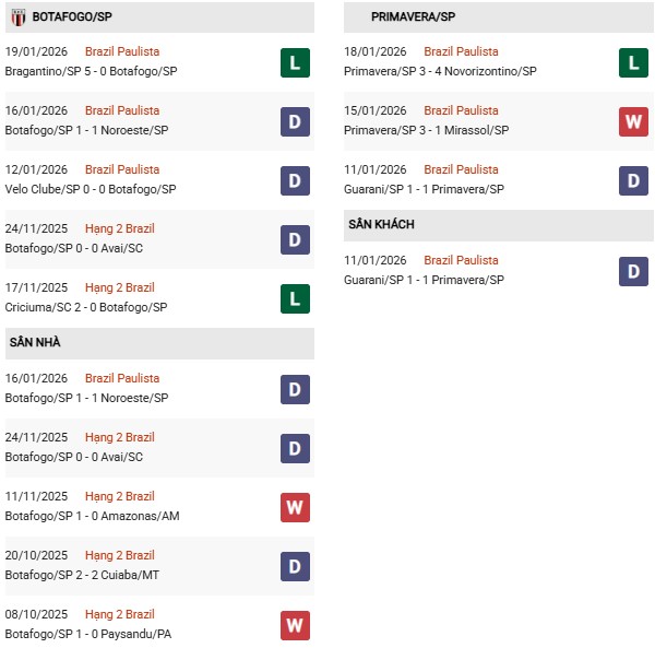 Thống kê phong độ Botafogo SP vs Primavera: