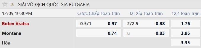 Thông tin tỷ lệ Botev Vratsa vs Montana:
